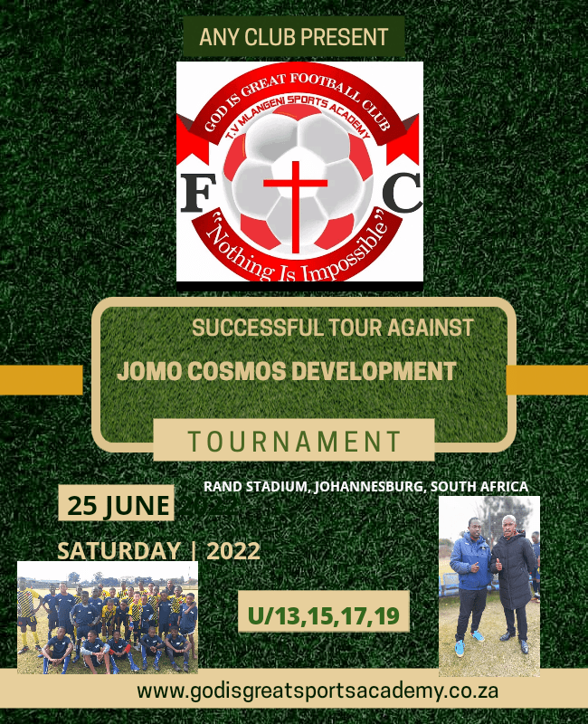 God Is Great Sports Academy visited Jomo Cosmos Development teams u13, 15,17 and 19,on the 25th June 2022,for friendly Games at Rand Stadium (Johannesburg),with the view of exposing the raw talent coming from their Academy to professional Development Level.So that the players can Learn as much as they can.The games will help them to see is possible to make it in Professional Set up , provided the hard work they put on and off the field.The tour went well as the Boys really enjoyed every moment of the exposure, and all thanks to Jomo Cosmos Management for making the outcome happened ,also they warm welcomed of God Is Great players was a Blessing.It was a great Motivation from Mr Bamuza Sono after the games , also encouraging them to take their Football Career seriously ,Work harder and Stay Discipline.Mother’s day present to our beloved Academy friends and followers,At Monontsha Stadium with entertaining Football,the players display a magnificent performance through out the games regarding our fruitful Sunday program @9am up until 13h00pm.